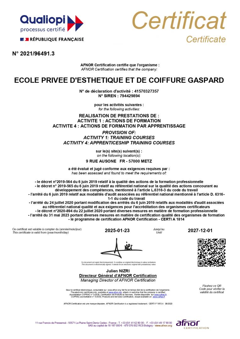 "CONCEPTION ET REALISATION D'ACTIONS DE FORMATION PROFESSIONNELLE ET PROFESSIONNELLE DIPLOMANTE NOTAMMENT DANS LES DOMAINES DE LA COIFFURE ET DE L'ESTHETIQUE ET PRESTATIONS ASSOCIEES (SUIVI DE PLACEMENT ET D'AIDE A L'EMPLOI DES ELEVES)."